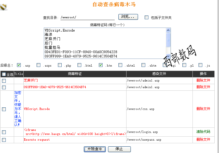 因傳統(tǒng)殺毒軟件不能有效地識(shí)別網(wǎng)頁(yè)木馬,特別是網(wǎng)頁(yè)木馬經(jīng)常被加殼或制作為變種!所以我司自主開(kāi)發(fā)了專門(mén)針對(duì)網(wǎng)頁(yè)木馬的殺毒軟件,每天晚上自動(dòng)掃描所有網(wǎng)站。發(fā)現(xiàn)木馬的,對(duì)該文件自動(dòng)更名;發(fā)現(xiàn)iframe病毒的,對(duì)病毒代碼自動(dòng)清除;并自動(dòng)通過(guò)電子郵件通知你,讓您輕松掌握您的網(wǎng)站情況