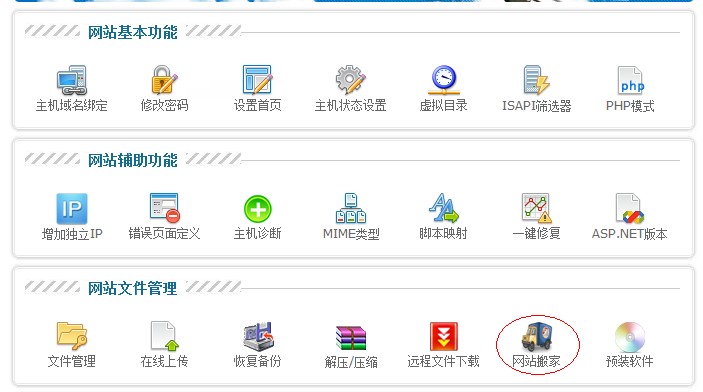 首先進(jìn)入到新的虛擬主機(jī)管理面板,點(diǎn)擊“網(wǎng)站搬家”