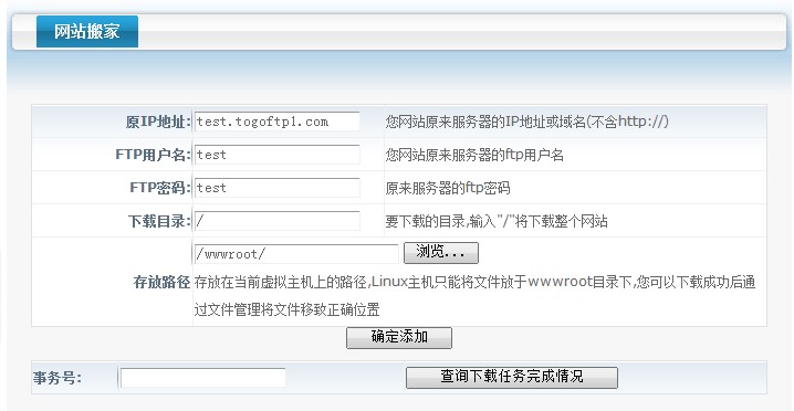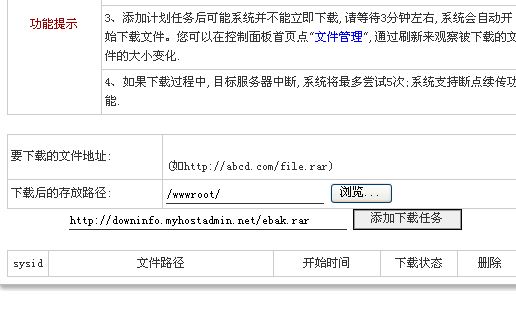 b)"下載后存放路徑"保持默認(rèn)的/wwwroot/不變,在“添加下載任務(wù)”前填寫(xiě)“http://downinfo.myhostadmin.net/ebak.rar”并點(diǎn)擊“添加下載任務(wù)”,