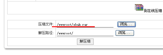 d)在“壓縮文件”處選擇剛才下載的文件“ebak.rar”,解壓路徑默認(rèn)不變,“/wwwroot/”,并點(diǎn)擊解壓縮。(圖4)