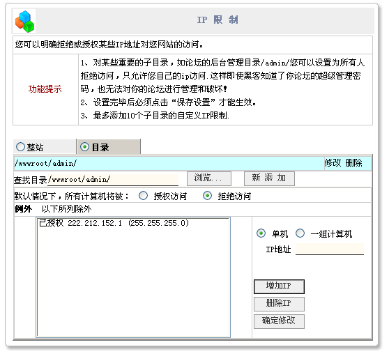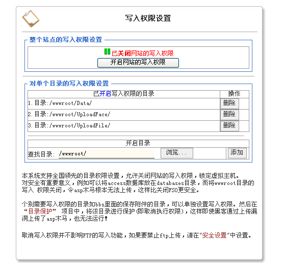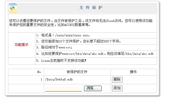 5. 整站設(shè)置為只讀(在控制面板中點(diǎn)文件管理),單獨(dú)把數(shù)據(jù)庫文件設(shè)置為完全控制權(quán)限。 我們的思路:防止木馬上傳-即使上傳了也不能執(zhí)行-即使有了權(quán)限也不能登錄后臺(tái)-即使能夠上傳我們也能很容易發(fā)現(xiàn)和清除。 通過以上組合設(shè)置,輕松打造史上最安全的網(wǎng)站!