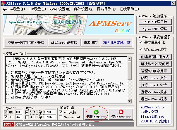 APMServ 5.2.6 是一款擁有圖形界面的快速搭建Apache 2.2.9、PHP 5.2.6、MySQL 5.1.28&4.0.26、Nginx 0.7.19、Memcached 1.2.4、phpMyAdmin 2.11.9.2、OpenSSL、SQLite、ZendOptimizer,以及ASP、CGI、Perl網(wǎng)站服務(wù)器平臺(tái)的綠色軟件。無(wú)需安裝,具有靈活的移動(dòng)性,將其拷貝到其它目錄、分區(qū)或別的電腦時(shí),均只需點(diǎn)擊APMServ.exe中的啟動(dòng)按鈕,即可自動(dòng)進(jìn)行相關(guān)設(shè)置,將Apache和MySQL安裝為系統(tǒng)服務(wù)并啟動(dòng)。APMServ集合了Apache穩(wěn)定安全的優(yōu)點(diǎn),并擁有跟IIS一樣便捷的圖形管理界面,同時(shí)支持MySQL 5.0 & 4.0兩個(gè)版本,虛擬主機(jī)、虛擬目錄、端口更改、SMTP、上傳大小限制、自動(dòng)全局變量、SSL證書制作、緩存性能優(yōu)化等設(shè)置,只需鼠標(biāo)一點(diǎn)即可完成。