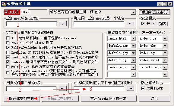 保存好虛擬主機(jī)后,要點(diǎn)擊“重啟Apache使設(shè)置生效”,新的站點(diǎn)才會(huì)生效。