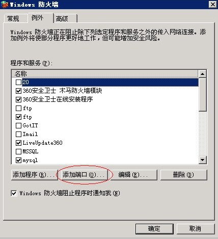如果沒有提示,則點(diǎn)擊“例外”,檢查下是否已經(jīng)添加21端口和另外兩個(gè)PASV端口(比如您遠(yuǎn)程連接是52300,那這兩個(gè)端口就是52301和52302),如果沒有,需要增加這三個(gè)端口號(hào),如圖: