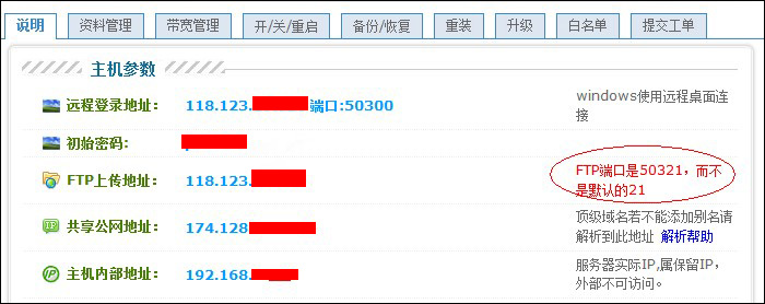 4、使用FTP軟件連接時(shí),端口不是21,比如您遠(yuǎn)程連接端口是5**00,則FTP端口是5**21。您登錄到我司管理中心——業(yè)務(wù)管理——獨(dú)立IP主機(jī)管理中,可以查看到端口號(hào)。如圖: ![]() 如果根據(jù)以上教程設(shè)置后FTP還是無法連接,請(qǐng)檢查您的FTP軟件是否開啟PASV模式,或提交工單咨詢我司技術(shù)工程師。