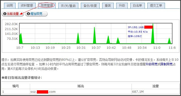 點擊“帶寬管理”——“當前流量”,可以查看到當前您VPS/云主機上的站點所使用的流量,此處的流量會比您看到的總流量小一些,因為您的服務器除了您的網(wǎng)站,服務器上的其他軟件還會產(chǎn)生一些流量。如圖: