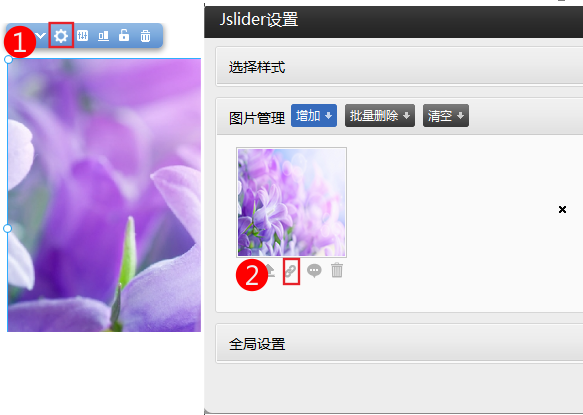 說明如上 4、 插件中的圖片添加link(以jslider幻燈展示為例) 添加了jslider幻燈展示后,逐張?zhí)砑訄D片,圖片添加完,點(diǎn)擊“圖片管理”右邊的“+”號(hào)打開圖片管理功能,如下圖: