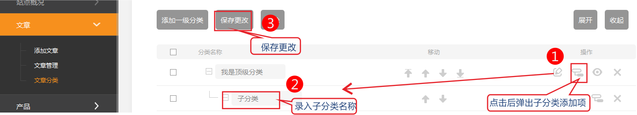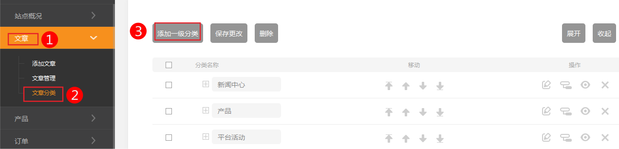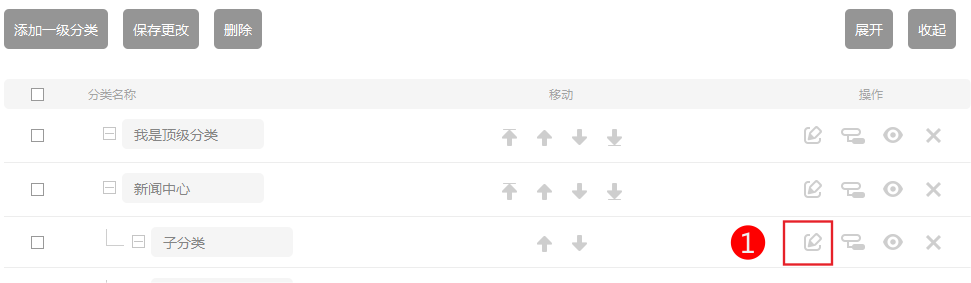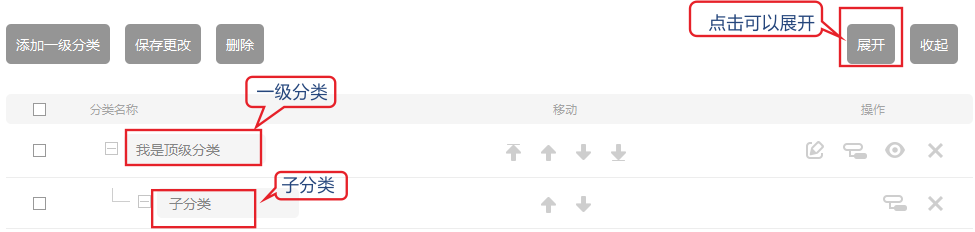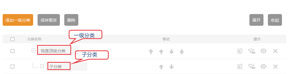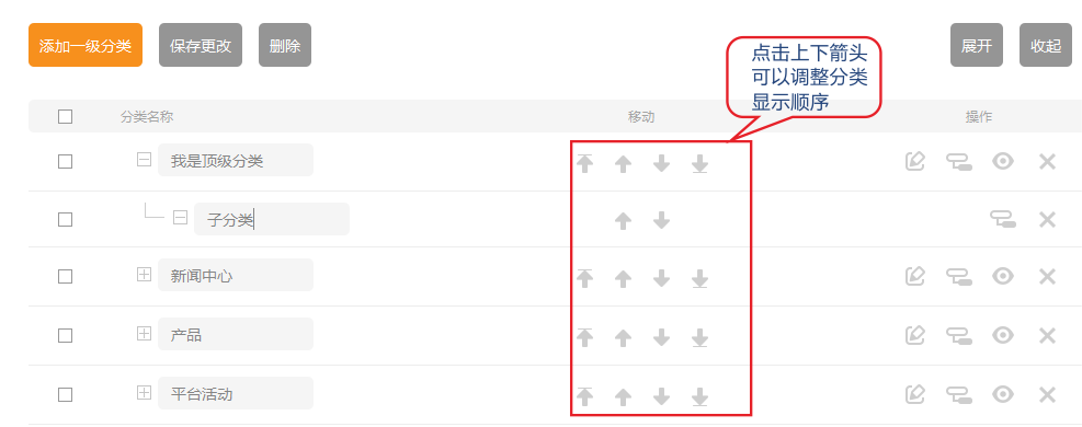 點擊上下箭頭可以調(diào)整分類顯示順序; “順序”:點擊上下箭頭可以移動分類顯示順序; “發(fā)布”:控制該分類是否在網(wǎng)站頁面上顯示; “編輯”:可修改分類名稱,樣式及其上級分類; “刪除”:刪除該分類。 4、調(diào)整分類的層級