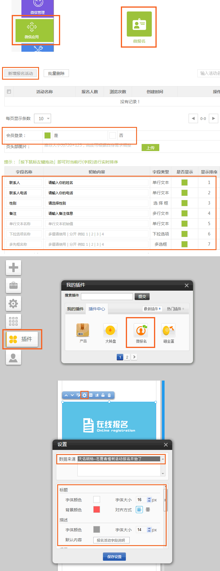 后臺:可以添加多個報名活動,自定義報名表單內(nèi)容,設(shè)定是否需要會員登錄,查看報名參加人員