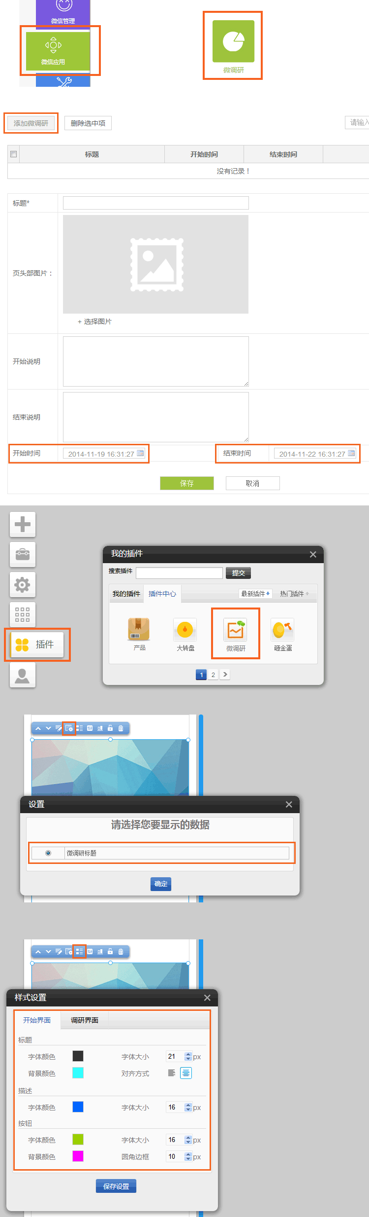 后臺:可以添加多個調(diào)研活動,自由編輯調(diào)研題目,可設(shè)定調(diào)研開始和結(jié)束時間,查看調(diào)研統(tǒng)計結(jié)果前臺:插件中心,新增微調(diào)研插件可選擇使用哪個調(diào)研活動數(shù)據(jù) 可設(shè)置調(diào)研開始和結(jié)束界面樣式