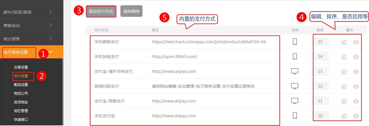 在線網(wǎng)關(guān):也稱第三方支付網(wǎng)關(guān),站長預(yù)先在支付網(wǎng)關(guān)平臺上申請帳號,審核通過后在后臺配置生效。當(dāng)顧客也有相同的支付平臺帳號時(shí),就可以選擇在線網(wǎng)關(guān)支付,跳轉(zhuǎn)到網(wǎng)關(guān)平臺付款完成后會返回一個(gè)狀態(tài)給網(wǎng)站,然后店主根據(jù)狀態(tài)情況來進(jìn)行后續(xù)操作。因?yàn)橛辛说谌降谋WC,在線網(wǎng)關(guān)使用相對會更安全些。目前常用的在線網(wǎng)關(guān)有支付寶、財(cái)付通、快錢、paypal等。 依次點(diǎn)擊》電子商務(wù)設(shè)置-》支付設(shè)置,可以看到系統(tǒng)已經(jīng)內(nèi)置了一些常用的支付方式,再配置一下帳號就可以使用了。