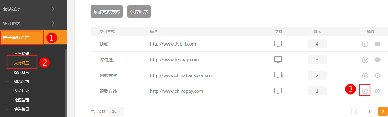 2、簽約成功后得到商戶名稱、商戶帳號(hào)、商戶密鑰。然后回到網(wǎng)店中設(shè)置。 3、網(wǎng)店中設(shè)置流程。 1.依次點(diǎn)擊電子商務(wù)設(shè)置->支付設(shè)置在銀聯(lián)在線中點(diǎn)擊編輯。
