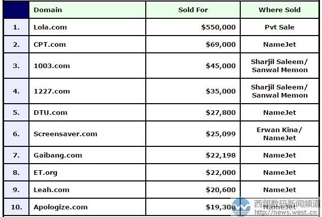 西部數(shù)碼(west.cn)6月8日消息,本期的DN交易榜(5.22-6.4)上,短域名占據(jù)了絕大多數(shù)席位,其中賣價最貴的域名是lola.com,成交價為550,000美元,約合人民幣374萬元。