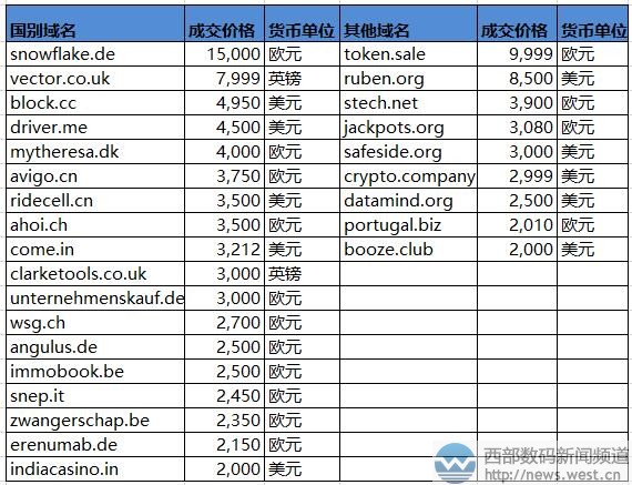 國別域名方面,來自德國的域名snowflake.de以15,000歐元結(jié)拍,約合人民幣11.5萬元。其主體英文snowflake卻有“雪花、雪片”的中文含義,不少相關(guān)域名的成交價都不錯。比如,snowflakedb.com曾在2014年被SnowFlake Computing(雪花計算)公司以近4萬元的價格收購;英文域名snowflake.co.uk也在今年5月底拍出了約10.6萬元的價格。 其他域名方面,本期三枚新頂級域名榜上有名。其中,token.sale有“代幣銷售”的意思,很適合搭建虛擬貨幣電商類平臺,成交價為9,999歐元,約合人民幣8萬元。同樣適合虛擬貨幣領(lǐng)域的還有域名crypto.company,成交價為2,999美元,該域名有“加密公司”的意思,可用于加密貨幣平臺。除此以外,新頂級域名booze.club也以2000美元的結(jié)拍價上榜。 本文轉(zhuǎn)載自新聞資訊,原文鏈接:Sedo榜:“工作”類域名以20萬元領(lǐng)銜!3個新頂級域名表現(xiàn)搶眼!