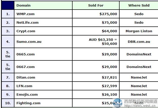 域名WMP.COM注冊(cè)于2003年7月,距今14年歷史,對(duì)應(yīng)有中文里的“完美屏、微名片、我買票、外賣品”等含義,適合搭建票務(wù)、外賣等平臺(tái)。除此以外,WMP對(duì)應(yīng)微軟媒體播放器Windows Media Player的首字母縮寫,所以微軟也是域名wmp.com的潛在終端。三聲母域名可挖掘的含義十分豐富,可與眾多終端匹配,市場(chǎng)價(jià)值頗高。 排名第二的英文域名netlife.com,成交價(jià)為75,000美元,約合人民幣49萬(wàn)元。這個(gè)域名早在1996年就已注冊(cè),距今已超20年歷史了,由英文單詞“Net(球網(wǎng))”和“Life(生活)”構(gòu)成,簡(jiǎn)單好記,適合搭建生活創(chuàng)意類平臺(tái)。據(jù)查詢發(fā)現(xiàn),相關(guān)域名NetLife.hu/.ec/.vn均已啟用建站了,由此可見(jiàn)應(yīng)用價(jià)值相當(dāng)不錯(cuò)。 隨后是以64,000美元成交的域名crypt.com(約合人民幣42萬(wàn)元),該域名有“地窖”、“加密字符”的意思,尤其是“加密”一詞,對(duì)應(yīng)當(dāng)前火熱的虛擬貨幣領(lǐng)域,很適合搭建加密貨幣交易、資訊平臺(tái)。 接著一枚長(zhǎng)尾域名sumo.com.au也拍出了50,600美元的價(jià)格,約合人民幣33萬(wàn)元。Sumo是“相撲”的意思,適合搭建相撲相關(guān)平臺(tái)。除此以外,也有不少終端以sumo命名,比如網(wǎng)站工具sumo,就啟用了相關(guān)域名sumo.com;另外一款交通仿真軟件也以sumo命名。 除了英文域名,兩個(gè)數(shù)字域名0655.com和0667.com均以29,000美元上榜,約合人民幣19萬(wàn)元。數(shù)字域名簡(jiǎn)單易記,加上建站不受限制,可廣泛用于游戲、金融、網(wǎng)址導(dǎo)航以及門戶類網(wǎng)站,應(yīng)用空間比較廣泛。 除此以外,其他域名也有不少表現(xiàn),像雙拼域名ditan.com、三字母域名LFN.com等成交價(jià)也不低,交易詳見(jiàn)下圖: