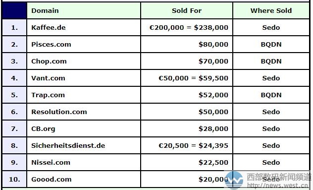DN榜:“咖啡”域名kaffee.de成目前為止今年最貴國別域名!西部數(shù)碼(west.cn)9月18日消息,本期 DN交易榜(9.4-9.10)上,國別域名異常搶眼,其中德國域名Kaffee.de以238,000美元在sedo平臺結(jié)拍,約合人民幣156萬。該域名不僅是本期DN幫上成交價(jià)最高的域名,也是今年目前為止賣價(jià)最高的國別域名。