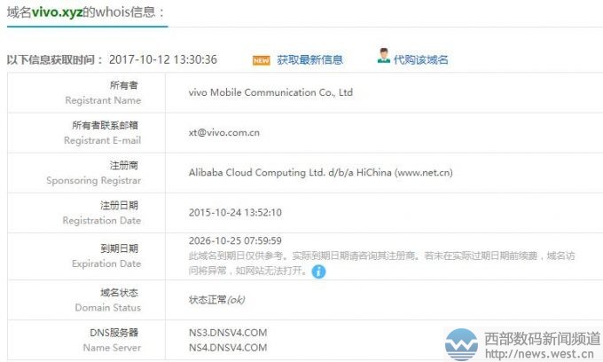 查詢whois信息可以發(fā)現(xiàn),域名vivo.xyz注冊于2015年10月,最近的更新日期為今年4月份,所有者顯示為維沃移動通信有限公司(vivo Mobile Communication Co., Ltd)。從這個時間推斷,域名vivo.xyz應(yīng)該是在4月初就完成了交易。