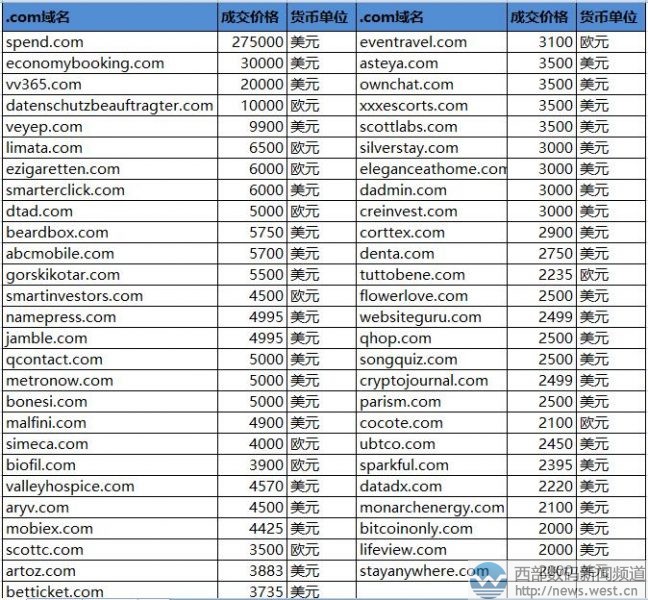 西部數(shù)碼(west.cn)11月29日消息,據(jù)外媒消息,最新一期的sedo交易榜剛剛出爐。本期共有78個域名超2000美元成交,其中冠軍由雙拼域名spend.com以275,000美元摘得,約合人民幣182萬元。
