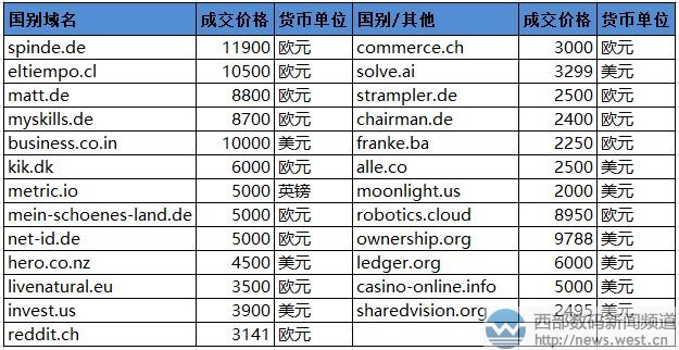 國別域名方面,德國國家域名繼續(xù)領(lǐng)銜,本期排在第一的是spinde.de,成交價為11,900歐元,對應有一款名為Spin.de的手機軟件。Matt.de(表面暗淡的)、myskills.de(我的技能)等德國域名也分別拍除8800歐元、8700歐元。