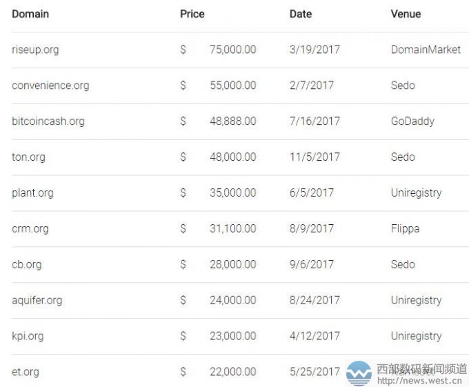 .org域名2017年年度交易榜:riseup.org以49萬元奪冠西部數(shù)碼(west.cn)1月8日消息,近日外媒公布了.org域名2017年年度TOP100交易榜,其中英文域名riseup.org以75,000美元高居榜首,約合人民幣49萬元。