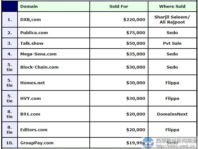 來(lái)源西部數(shù)碼新聞資訊:域名DXB.COM以143萬(wàn)元領(lǐng)跑DN榜!新頂級(jí)六位數(shù)成交引關(guān)注