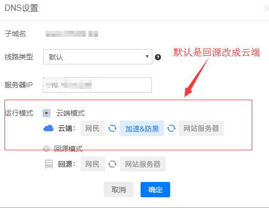 特別注意:設(shè)置好后看下截圖這個(gè)位置: 回源模式需要如截圖改為云端