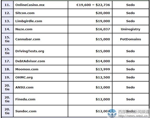 接著是三聲母域名CXP.com,成交價為31,000美元,約合20萬元。該域名有“促銷品、暢銷品、查詢票、抽象派”等含義,可搭建網(wǎng)絡促銷平臺、票務查詢網(wǎng)站、藝術平臺等。