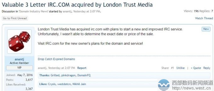 來源西部數(shù)碼新聞資訊,原文鏈接:身價六位數(shù)美金?倫敦信托媒體收購三字母域名IRC.com