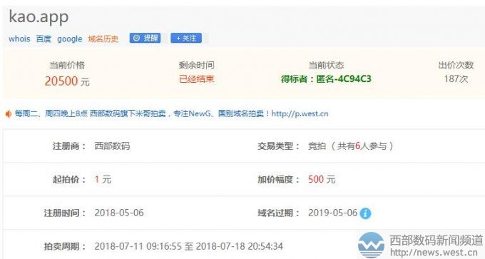 單拼域名kao.app在西部數(shù)碼五位數(shù)結(jié)拍!7月20日消息,.app域名自開放注冊(cè)以來,其受關(guān)注的程度一直居高不下,相關(guān)域名交易案例也時(shí)常傳出。據(jù)西部數(shù)碼最近成交記錄顯示,多枚.app域名完成交易,其中單拼域名kao.app以20,500元競(jìng)拍,雙拼域名haoqing.app則以10,000元一口價(jià)被秒。
