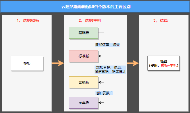 【云建站入手教程】2、云建站選購流程快捷導(dǎo)航: -------【云建站入手教程】-------- -------【云建站入手教程】-------- 本教程主要針對(duì)云建站PC+手機(jī)版本的選購做出建議 云建站需要購買的部分包含 模板+主機(jī) ,其中模板為一次性收費(fèi),主機(jī)是按年續(xù)費(fèi),只要主機(jī)在正常使用期間,模板都無需再繳納費(fèi)用,需要新的模板則需要單獨(dú)再購買。 模板只是界面設(shè)計(jì)效果,不影響網(wǎng)站的功能,網(wǎng)站的功能是由主機(jī)版本決定的。 選購流程如下圖: