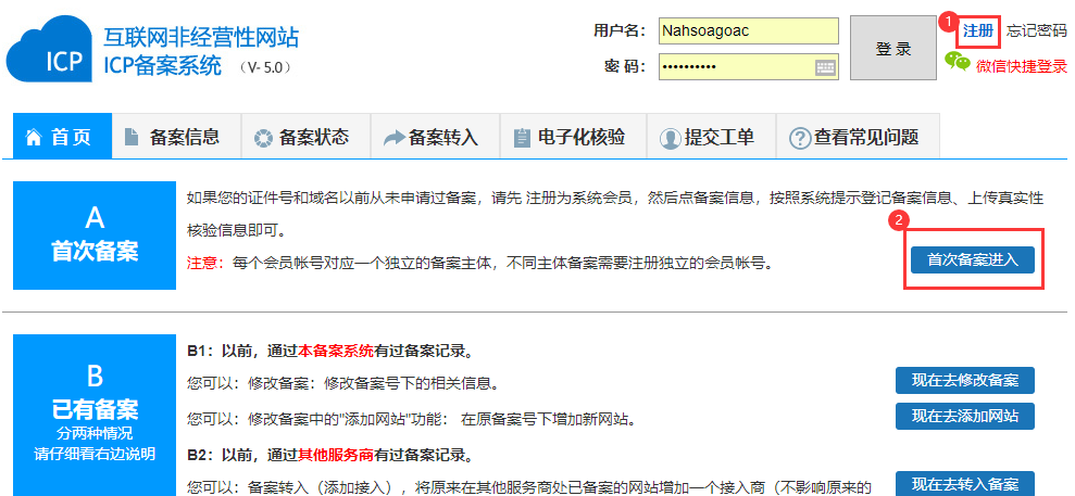 【云建站入手教程】4、云建站備案流程快捷導(dǎo)航: -------【云建站入手教程】-------- -------【云建站入手教程】-------- 1、登錄注冊 訪問備案地址:beian.vhostgo.com ,點擊右側(cè)的“用戶注冊”,注冊一個賬戶,登陸到備案系統(tǒng),點擊首次備案進入(注:該帳號非我司官網(wǎng)帳號,需要單獨注冊)