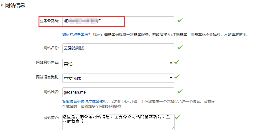 2、完善信息 一個完整的備案包含“主體+網(wǎng)站”兩部分,主體代表這個備案隸屬的企業(yè)或個人,網(wǎng)站則代表在這個主體下的備案站點。 請您進入備案界面后首先完善主體信息,注意: a.單位性質(zhì)務(wù)必選擇正確的信息,如果是企業(yè)就是企業(yè),如果是個人就寫個人 b.主辦單位名稱:企業(yè)必須與營業(yè)執(zhí)照上的單位名稱一致,個人必須與最新身份證號上的信息一致,個人備案注意檢查身份證過期時間,一個月內(nèi)要過期的,請先辦理身份證換新 詳細備案流程請參考: (1)使用電子化在線核驗的備案流程(企業(yè)):https://beian.vhostgo.com/faq/show.asp?c3lzaWQ9ODc= (2)使用電子化在線核驗的備案流程(個人):https://beian.vhostgo.com/faq/show.asp?c3lzaWQ9ODY= 3、云建站備案碼的獲取 在備案流程中,當(dāng)主體填寫好,需要新增網(wǎng)站時會涉及到云建站的備案碼問題,備案碼的獲取請登錄會員中心,點擊業(yè)務(wù)管理中的云建站管理,在站點詳細信息,點擊查看備案碼獲取,