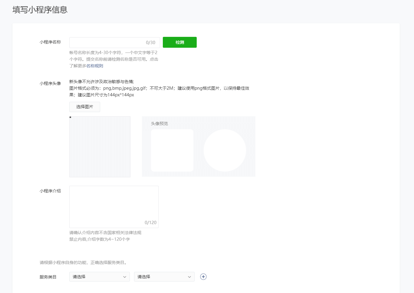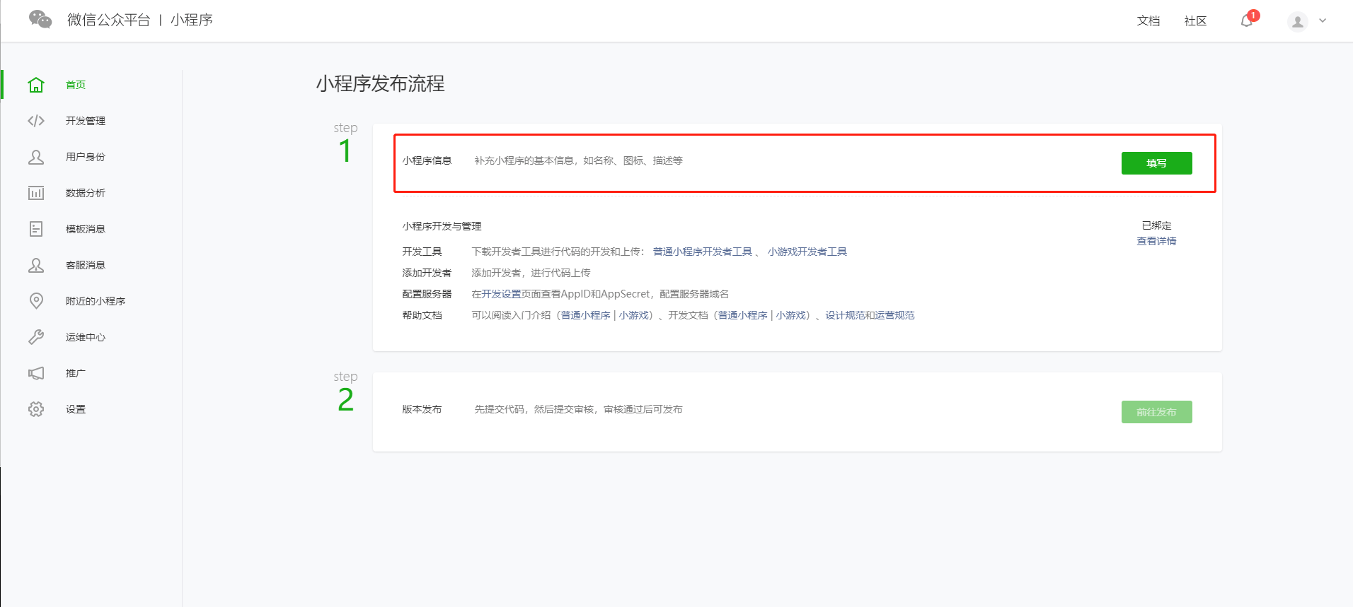 2.完善小程序信息注冊小程序后,登錄小程序后臺首頁,點擊【填寫】完善小程序信息,如名稱、圖標、描述等;