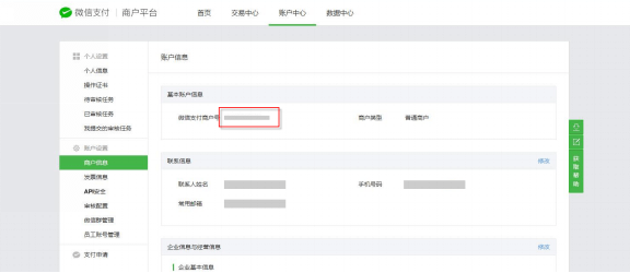 3.2獲取微信支付參數(shù)成功申請小程序微信支付后,通過鏈接https://pay.weixin.qq.com 登錄微信支付商戶平臺,獲取商戶號、商戶密鑰、下載API支付證書,各參數(shù)獲取說明如下說明: 3.2.1獲取商戶號點擊“賬戶中心”->“商戶信息”菜單,獲取微信支付商戶號,如下圖示;