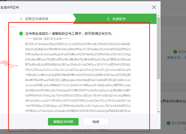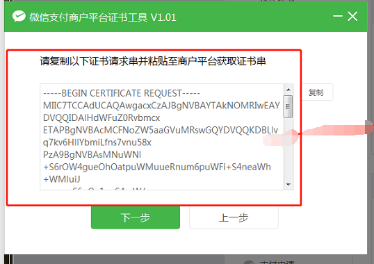 7、點擊下一步后會生成證書串【此時系統(tǒng)將認為申請證書成功】點擊【復制證書內(nèi)容】