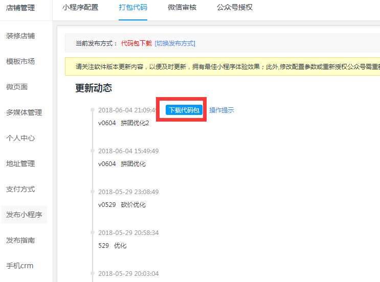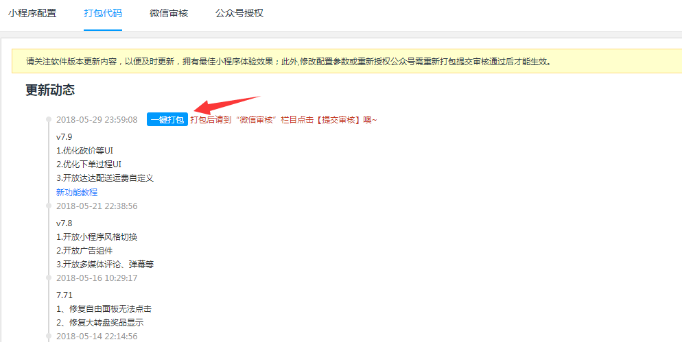 1.3在線更新打包授權(quán)綁定小程序后,在“打包代碼”頁面點擊【一鍵打包】按鈕打包小程序; 提示:請時刻留意該頁面版本更新情況,及時更新最新軟件版本,達到最佳體驗效果。