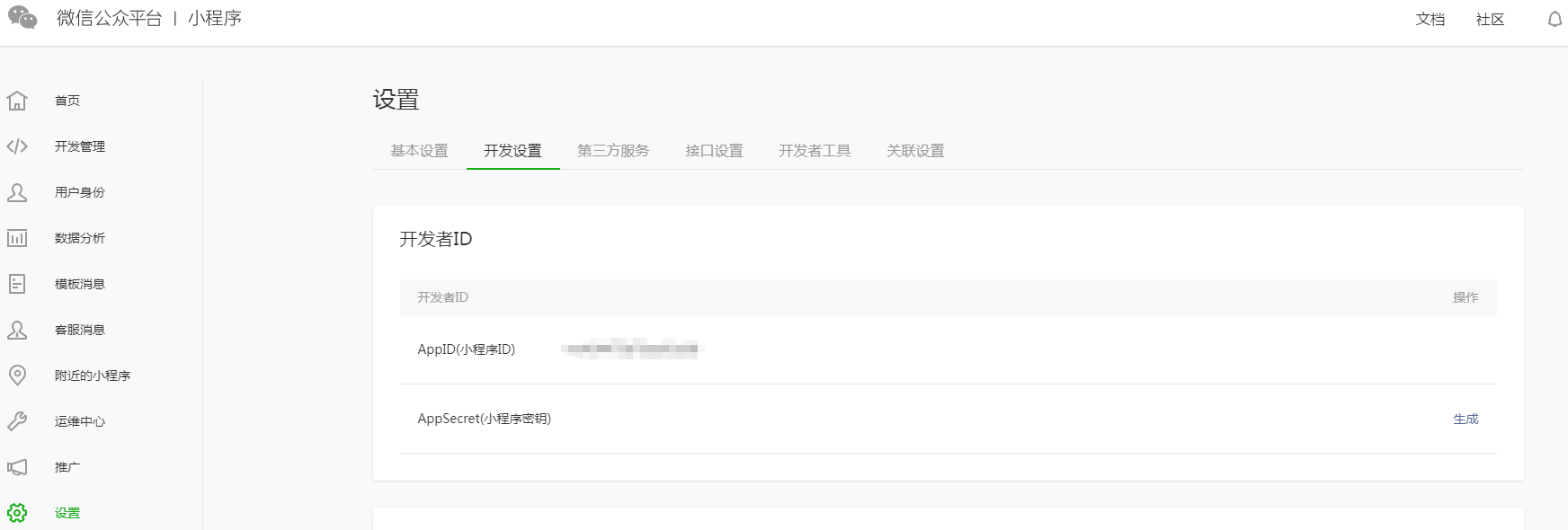 需要注意,AppSecret生成后不會明文存儲在開發(fā)平臺上,需要自行妥善保存,一旦遺失需要重新生成,可能會影響已發(fā)布小程序的正常使用。 2.2配置小程序服務器域名登錄微信小程序后臺,在設置——開發(fā)設置中,配置小程序服務器域名,詳細配置如下: