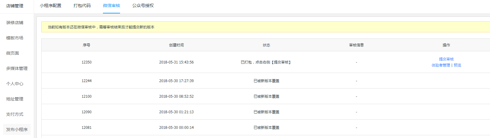 預覽后,點擊提交審核,將小程序提交到提交到微信進行審核。等待微信審核通過后,回到本頁面可以進行小程序發(fā)布。如審核不通過,需要根據(jù)微信審核意見進行修改并重新提交審核。注意,同一時間只能有一個小程序在審核中。