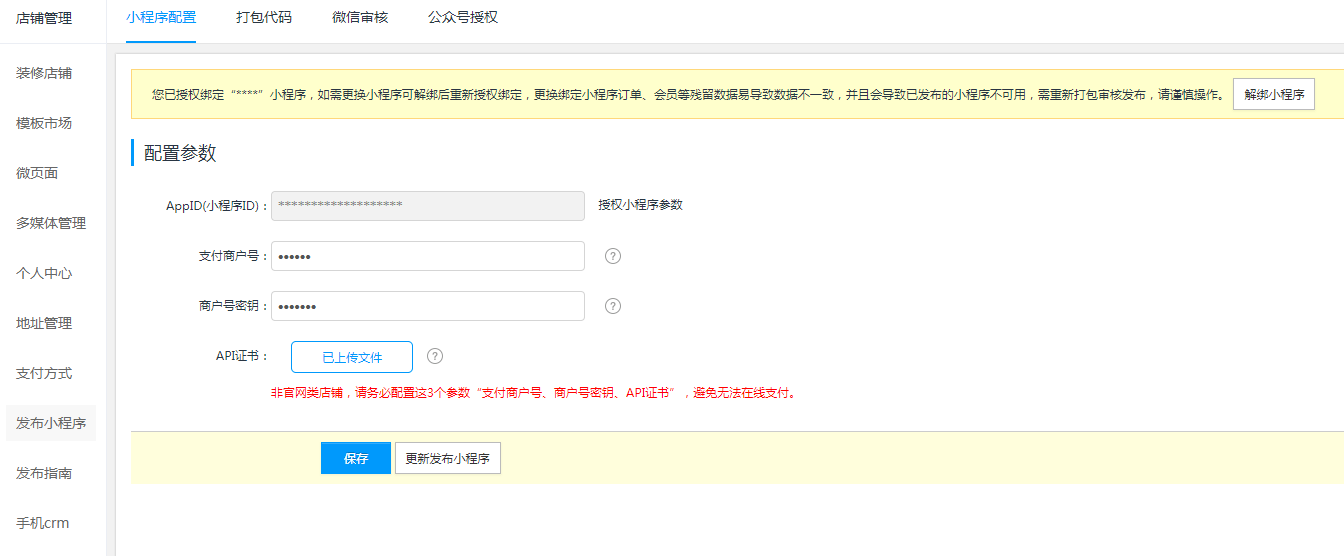 2.3支付參數(shù)配置(不涉及線上支付可跳轉(zhuǎn)本章節(jié))小程序商城等涉及在線支付,授權(quán)綁定小程序后,進入小程序配置頁面,輸入微信支付商戶號、商戶密鑰、上傳微信支付API證書(各參數(shù)獲取方式上一章節(jié)已說明);