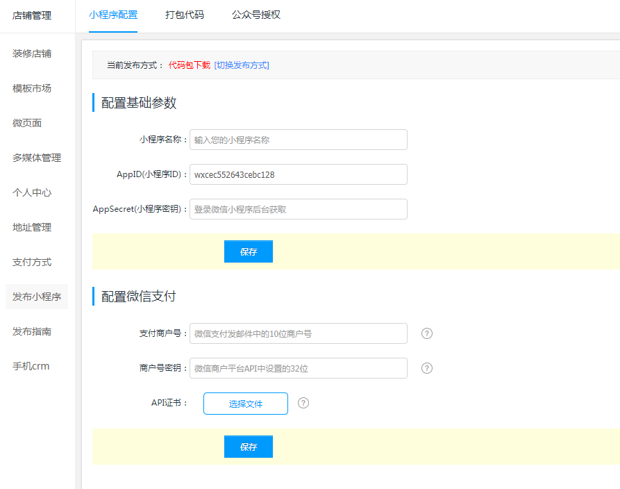 2.代碼下載代碼包下載是在平臺上下載小程序代碼包,自行通過微信開發(fā)者工具上傳代碼并通過微信公眾平臺完成小程序?qū)徍、小程序發(fā)布操作,適合對微信小程序較熟悉的用戶。 2.1配置小程序參數(shù)登錄管理后臺,點擊【店鋪】菜單->點擊【發(fā)布小程序】->點擊【小程序配置】,配置小程序的參數(shù):小程序名稱、AppID、AppSecret,AppID與AppSecret可登錄微信小程序后臺——設置——開發(fā)設置中獲;