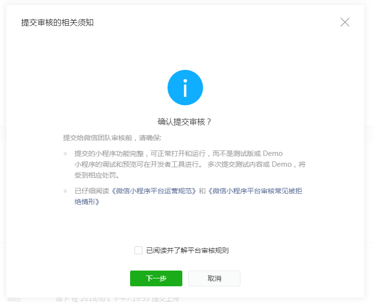 三、注意事項1.在線上傳與代碼包下載兩種小程序發(fā)布方式,同一時間只能使用其中一種。如果小程序已經(jīng)發(fā)布,隨意切換小程序發(fā)布方式會導致已發(fā)布的小程序無法正常訪問,必須重新提交審核通過后才能恢復訪問。2.代碼包下載的方式,將無法在本平臺對小程序進行預覽、提交審核以及發(fā)布小程序3.小程序提交審核前,請認真閱讀《微信小程序平臺運營規(guī)范》和《微信小程序平臺常見拒絕情形》并仔細檢查小程序內(nèi)容,提高小程序?qū)徍送ㄟ^的概率。