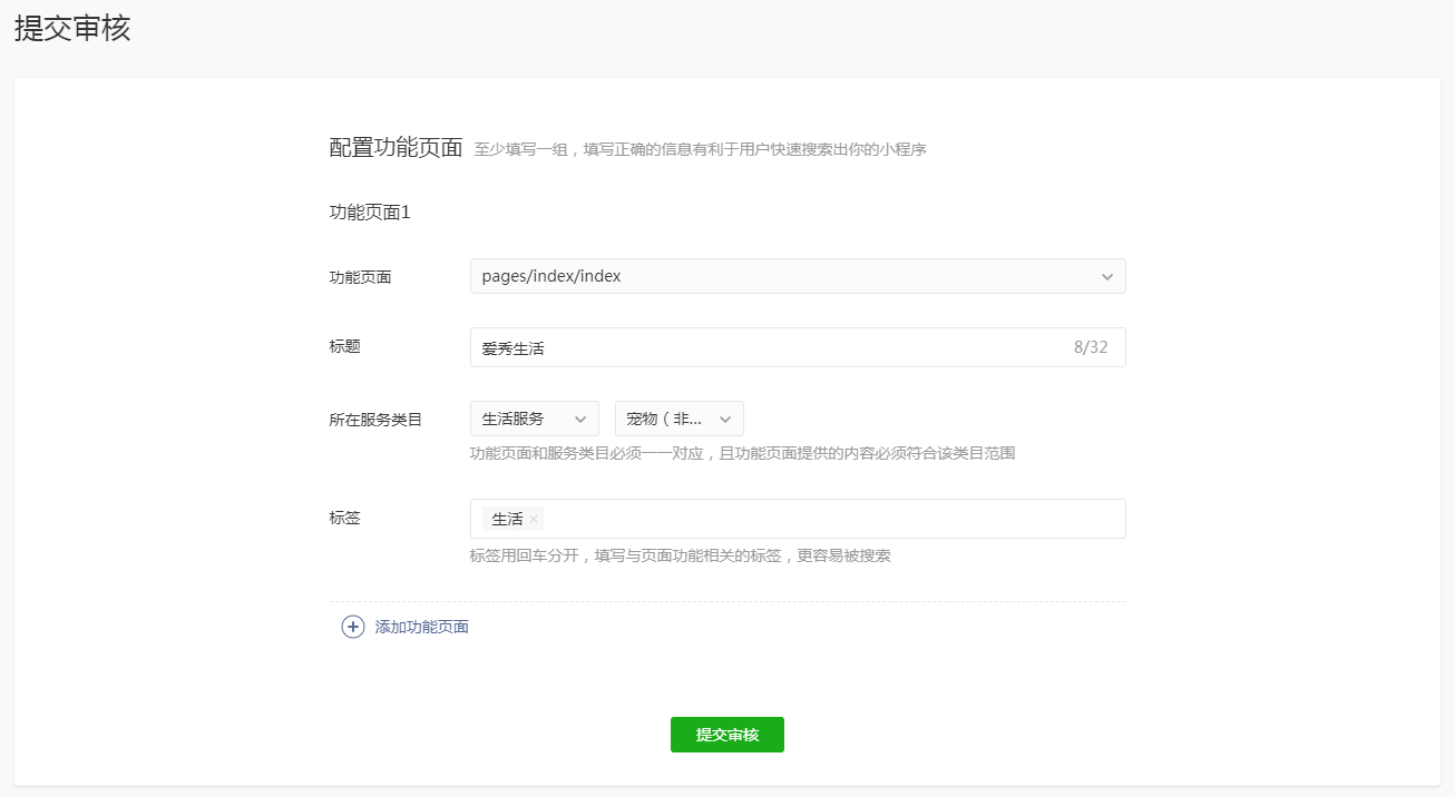 1.4提交審核/發(fā)布提交審核:每點擊【一鍵打包】打包小程序,在“微信審核”頁面會將會生成一條打包記錄,點擊【提交審核】將代碼包提交到微信進行審核,微信審核周期一般為7個工作日,在提交審核前請先認真閱讀《微信小程序平臺運營規(guī)范》和《微信小程序平臺常見拒絕情形》; 審核通過:微信審核通過后,點擊【發(fā)布】按鈕,稍等片刻,即可在手機微信小程序搜索中查到已發(fā)布的小程序,完成發(fā)布流程; 審核失。喝缥⑿艑徍耸≌堊⒁饪煽词√崾,及時登錄微信小程序后臺處理相關問題; 注意:同一時間只允許提交審核1個小程序。