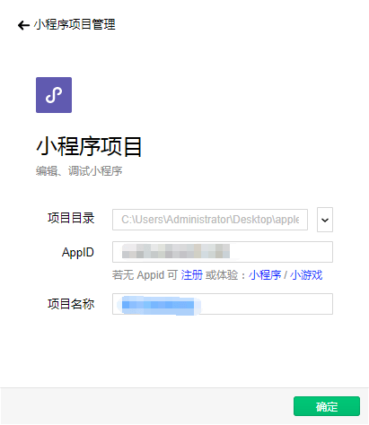 選擇項目目錄,找到并選擇剛解壓的小程序文件夾,點擊確定進行添加并輸入小程序的AppID和項目名稱