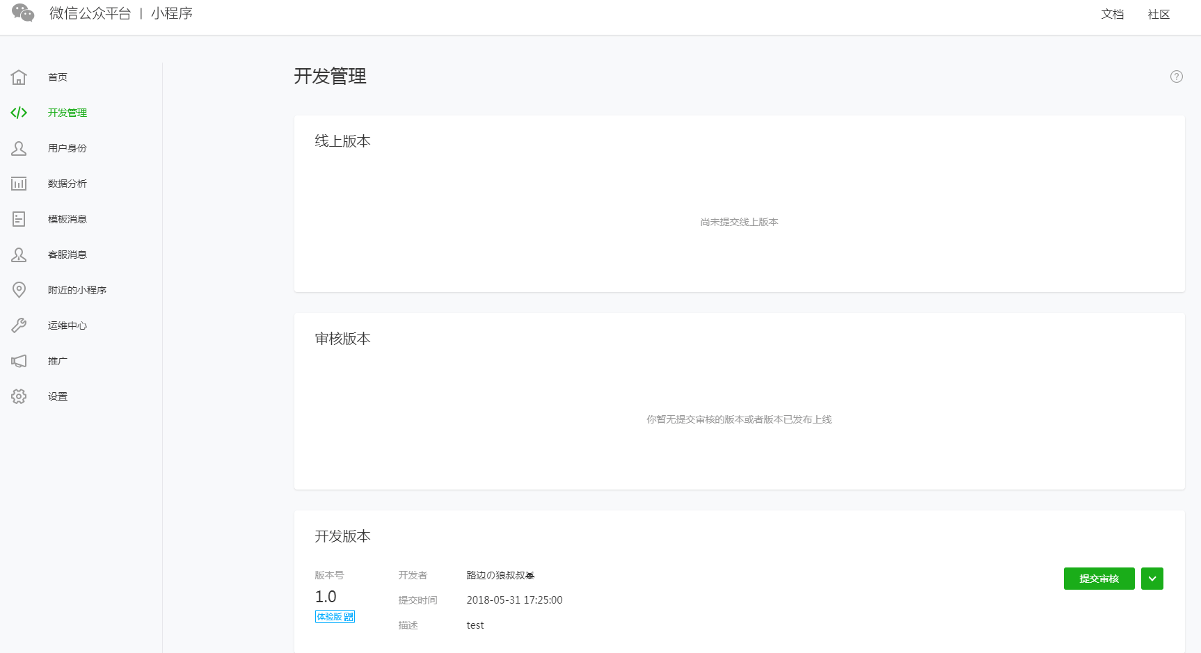 2.7預覽并提交審核登錄微信小程序后臺,在開發(fā)管理中,可以看到上一步中上傳的小程序