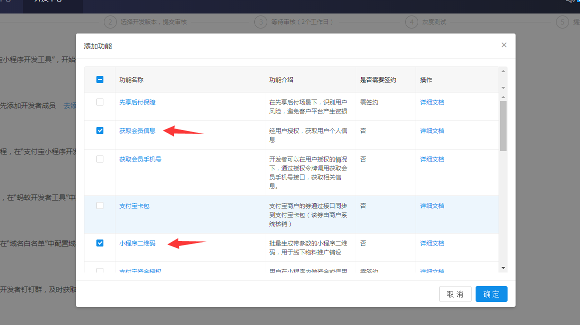 支付寶小程序發(fā)布指南一.前期準(zhǔn)備1.注冊(cè)支付寶小程序商家需要在支付寶小程序平臺(tái)官網(wǎng)首頁(yè)(https://open.alipay.com/channel/miniIndex.htm)點(diǎn)擊“立即接入”按鈕,可使用現(xiàn)有支付寶賬號(hào)直接掃碼登陸支付寶小程序開(kāi)發(fā)者平臺(tái)。 ![]() 登錄之后,需要完善信息才能創(chuàng)建小程序,注意要選擇“自研開(kāi)發(fā)者” ![]() 2.小程序創(chuàng)建完成資料填寫(xiě)后,可以在開(kāi)發(fā)中心——小程序應(yīng)用中創(chuàng)建小程序 ![]() 小程序信息填寫(xiě)完畢后可進(jìn)入查看并管理小程序。 ![]() 如果申請(qǐng)不通過(guò),需要根據(jù)反饋信息重新完善資料提交 3.小程序功能添加支付寶小程序功能需要自行在支付寶小程序詳情中添加,在開(kāi)發(fā)管理——功能列表中可以添加小程序功能,需要勾選添加“獲取會(huì)員信息”和“小程序二維碼”兩個(gè)功能。