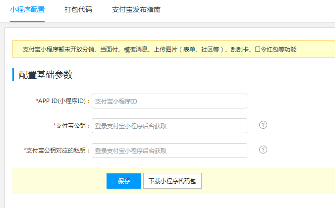 二、小程序發(fā)布1.代碼包下載代碼包下載是在平臺(tái)上下載小程序代碼包,自行通過(guò)支付寶開(kāi)發(fā)者工具上傳代碼并通過(guò)支付寶小程序平臺(tái)完成小程序?qū)徍、小程序發(fā)布操作。 1.1配置小程序參數(shù)登錄管理后臺(tái),點(diǎn)擊【支付寶小程序】->點(diǎn)擊【小程序配置】,配置小程序的參數(shù):AppID(小程序ID)、支付寶公鑰和小程序應(yīng)用私鑰,AppID可登錄支付寶小程序后臺(tái)——小程序詳情頁(yè)直接獲取,小程序應(yīng)用私鑰需要下載支付寶密鑰生成工具生成(下載鏈接:https://docs.open.alipay.com/291/105971/),支付寶公鑰需要將小程序應(yīng)用公鑰上傳到支付寶小程序后臺(tái)獲。