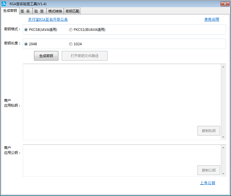 需要注意,小程序應(yīng)用私鑰等信息生成后需要自行妥善保存,一旦遺失可能需要重新生成,可能會(huì)影響已發(fā)布小程序的正常使用。 1.2小程序應(yīng)用密鑰獲取支付寶小程序配置時(shí)需要生成一對(duì)RSA密鑰,密鑰可下載支付寶密鑰生成工具生成(下載鏈接:https://docs.open.alipay.com/291/105971/),需根據(jù)區(qū)分Windows系統(tǒng)電腦和蘋(píng)果系統(tǒng)電腦 ![]() 以Windows系統(tǒng)為例,下載密鑰工具后,自行解壓打開(kāi),找到“RSA簽名驗(yàn)簽工具”文件,雙擊打開(kāi)運(yùn)行