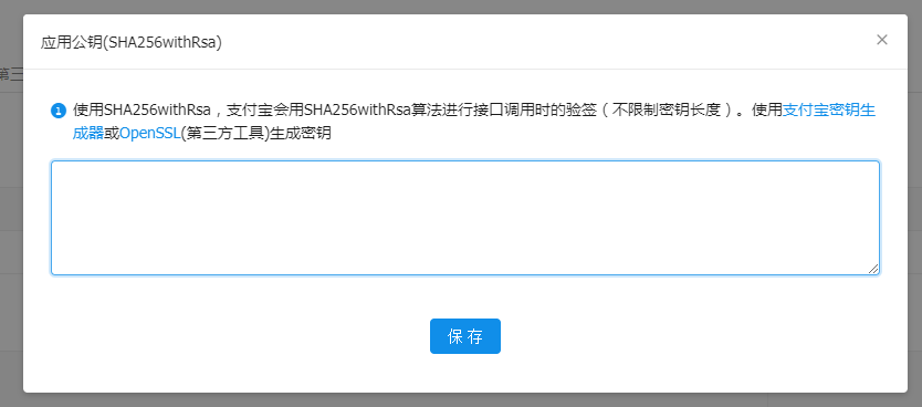 將1.2中生成的小程序應(yīng)用公鑰填寫(xiě)到輸入框中,點(diǎn)擊保存,保存小程序應(yīng)用公鑰到支付寶小程序后臺(tái)。保存成功后,在同一頁(yè)面查看或修改應(yīng)用公鑰或上傳應(yīng)用公鑰證書(shū)。