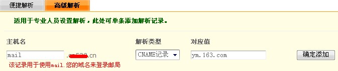 [原創(chuàng)]怎樣設(shè)置網(wǎng)易域名郵箱解析最近網(wǎng)易推出了域名郵箱 http://ym.163.com/ ,最大可創(chuàng)建200個(gè)同域名的帳號(hào), 非常受歡迎,但是解析卻遇到了困難在此講解下解析方法。 開通網(wǎng)易域名郵箱以后會(huì)看到如下的解析說(shuō)明: 以下截圖是域名在我司的解析方法: 首先點(diǎn)“DNS解析管理”--“高級(jí)解析”,主機(jī)名填寫“mail”,解析類型選擇“CNAME記錄”,對(duì)應(yīng)值填寫“ym.163.com”這點(diǎn)在增加網(wǎng)易域名郵箱那并無(wú)說(shuō)明,增加的目的是可以用mail.yourname.com來(lái)訪問,意思就是用mail.您的域名,來(lái)登陸郵局。