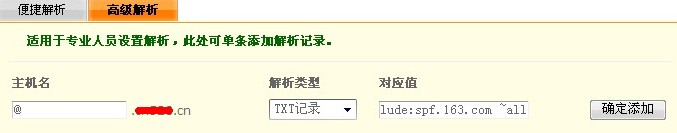 這里的主機(jī)名依然寫@,對(duì)應(yīng)值寫網(wǎng)易提供的“v=spf1 include:spf.163.com ~all ”不包含雙引號(hào)。然后點(diǎn)添加。